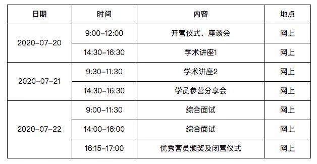 夏令营活动丰富,包括学术讲座、综合测试(网络面试)、圆桌讨论等。